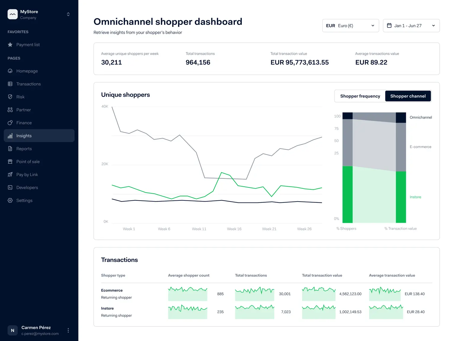 Get to know the customer behind each payment. Connect transactions to individuals and build a deeper understanding of their behavior. Track your performance across channels and regions and make informed business decisions. For example, see how opening a store can impact your ecommerce sales in that area.